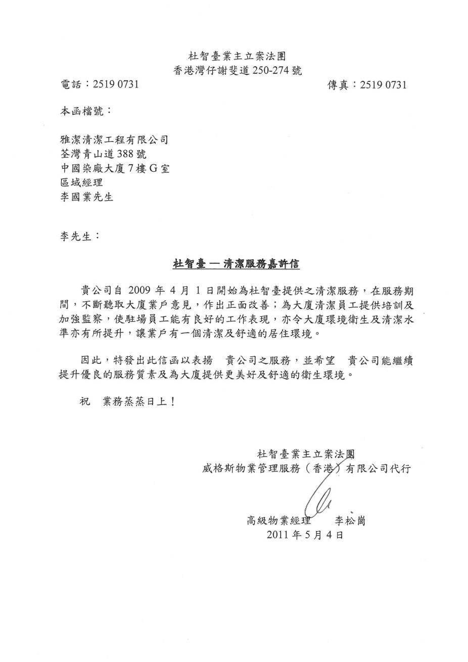 雅潔清潔透過員工培訓及監察,提升大廈清潔服務質素,改善住戶居住環境,故受到杜智臺業主立案法團讚賞。
